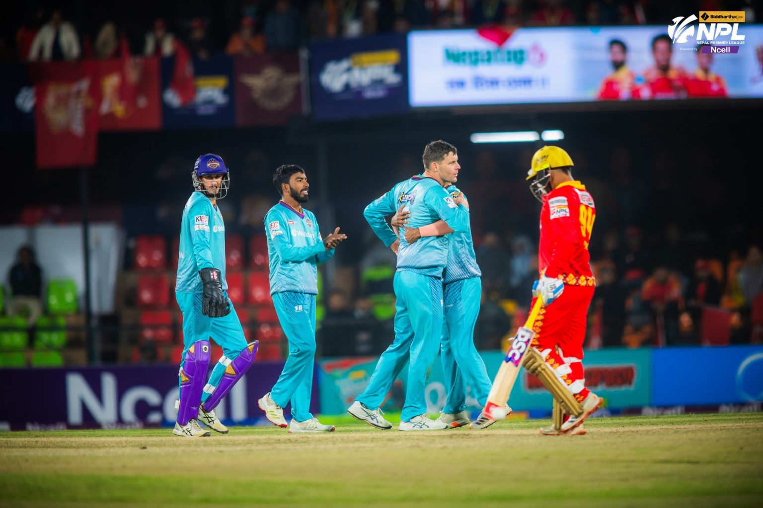 मात्र ११ बल खेलेका उनले ४ छक्का र १ चौकाको मद्दतले ३४ रनमा अविजित रहे । यस्तै, आकाश त्रिपाठीले ३२, सन्तोष यादवले २६, मिलिन्द कुमार र जेरहार्ड इरास्मसले १७–१७ रन बनाउँदा राशिद खानले १४ रन जोडे ।