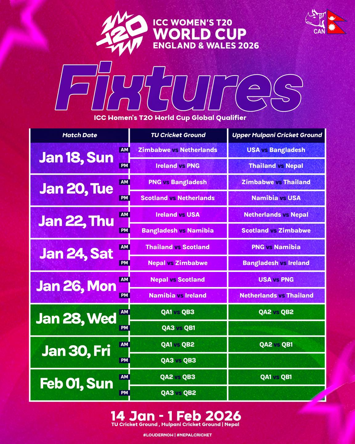 काठमाडौँ। नेपाल क्रिकेट सङ्घ (क्यान) ले नेपालमा आयोजना हुने आइसीसी महिला टी–२० विश्वकप ग्लोबल छनोटको खेल तालिका सार्वजनिक गरेको छ । उक्त प्रतियोगितामा विभिन्न १० राष्ट्रको सहभागिता रहेको छ ।